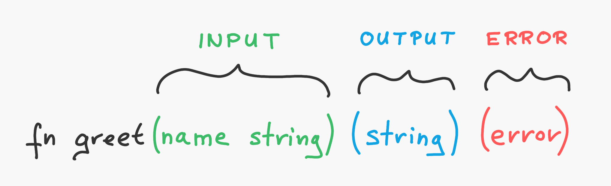 Let's jump to implementing the same with explicit error handling. Notice the ? in the signature, which tells the compiler that every possible error result must be explicitely handled. Also note the question mark in the call greet()?. Here it is used to propagate the error, should the call fail.