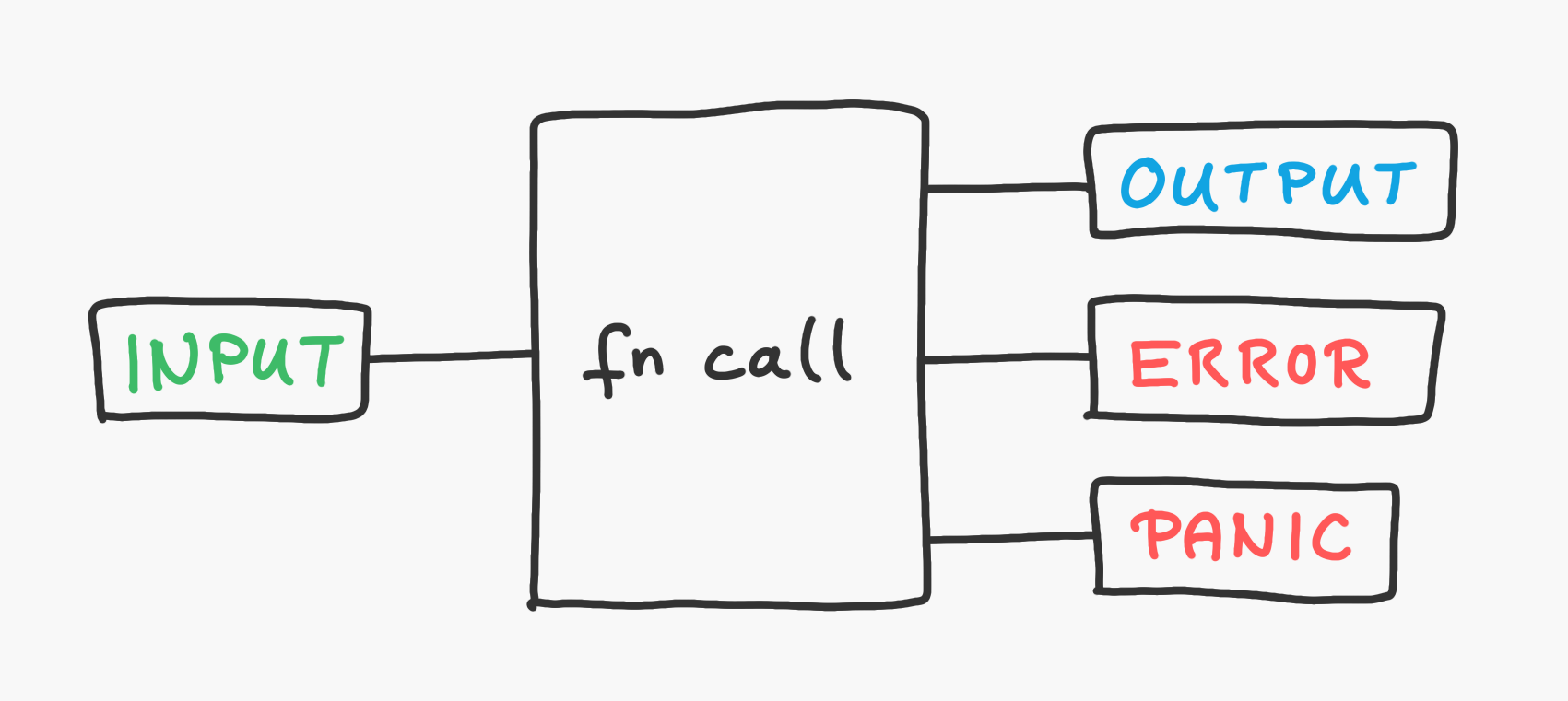 For completeness, there is a third scenario: every function may panic when encountering a developer error, alas a bug. Hence the result of a function call is one of these three values: an output (or success result), an error (or failure result), or a panic.